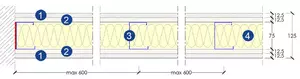 Mur ndarës me trashësi total 125mm, një strukturë me izolim lesh mineral dhe 2 pllaka rezistente në zjarr në secilën anë.